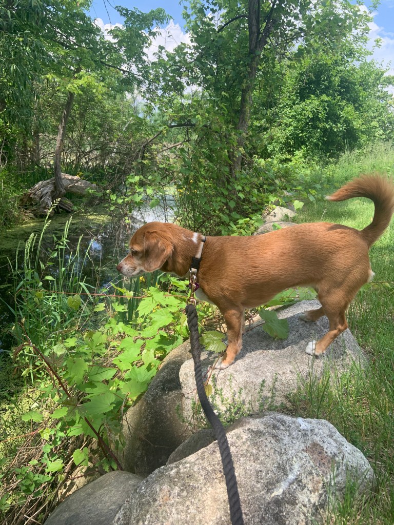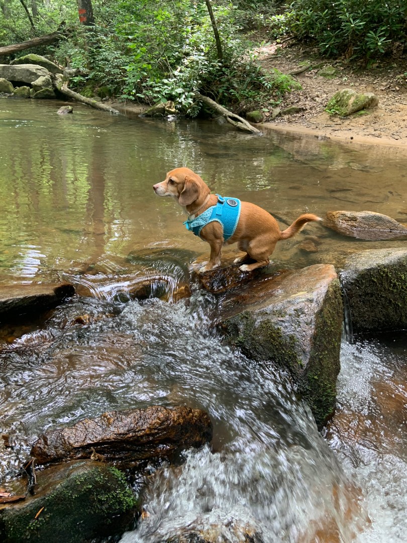 Cheagles have a natural aversion to water, but they will cross anything in the name of adventure!