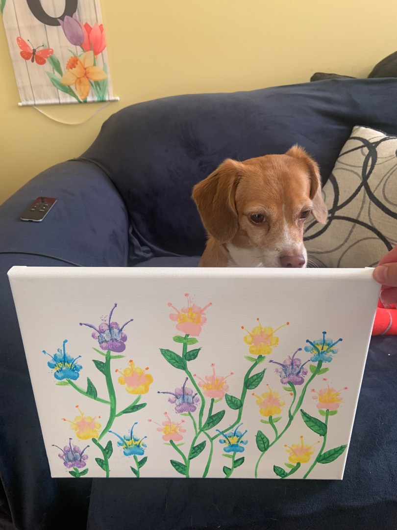 Henley has decided to pursue an artistic career full time as of today. She has completed her first painting which features her paw prints and flowers; she calls it “A Dog’s Paw Flowers”.