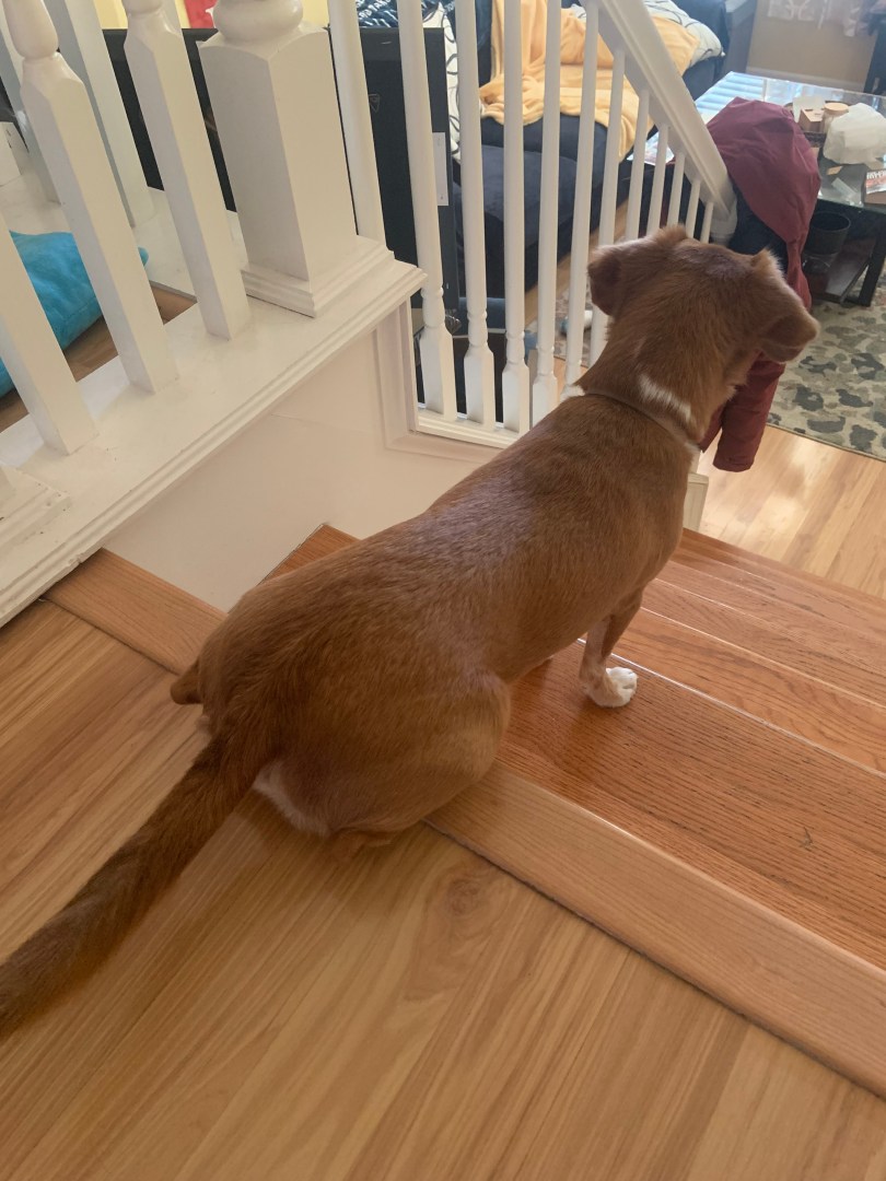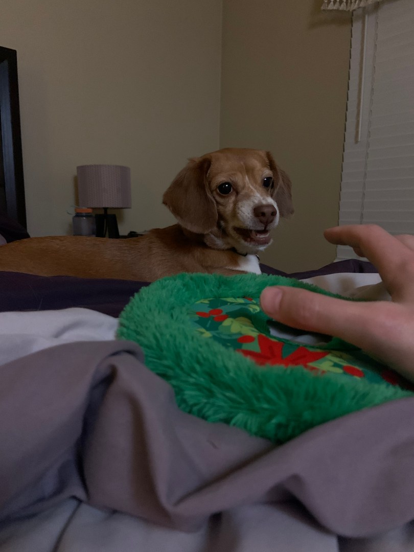 Cheagle moods can be hard to read. You may be surprised to learn this is a playful face. It comes from her Chihuahua side.