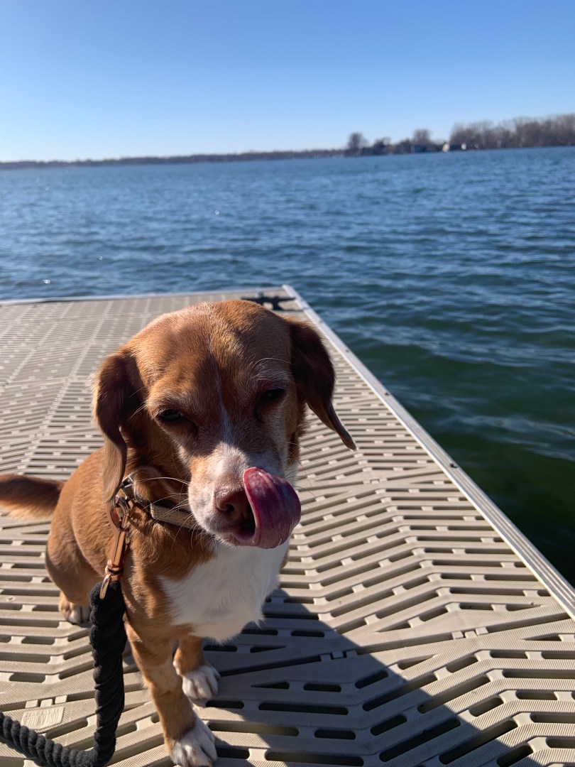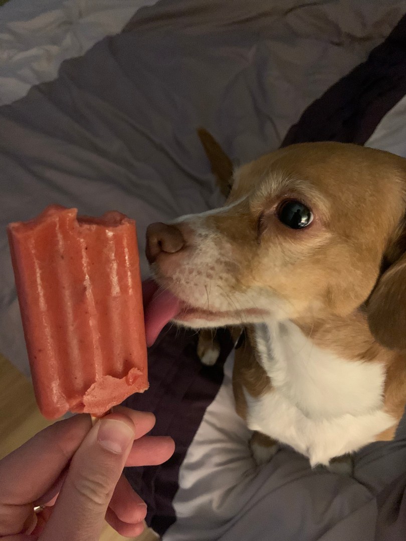 Be careful with cold foods for Cheagles. Cheagles are small and therefore have smaller brains which are more susceptible to brain freeze. Only a single lick for this Cheagle.