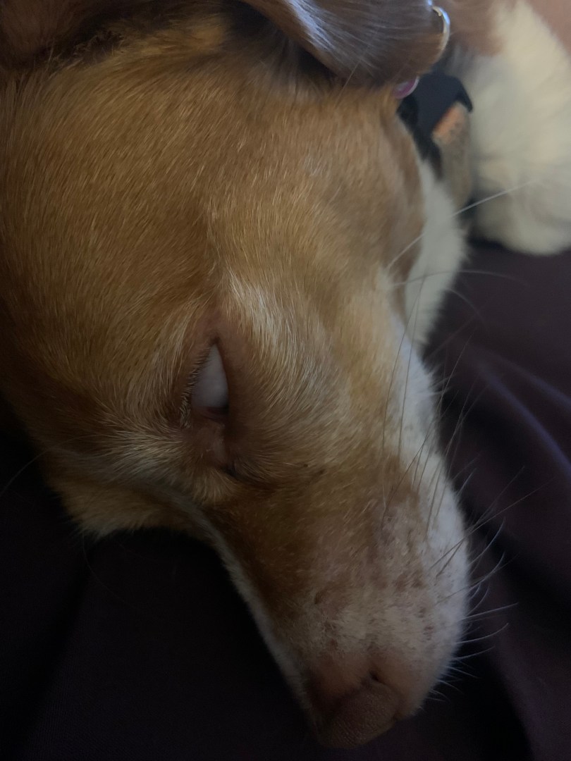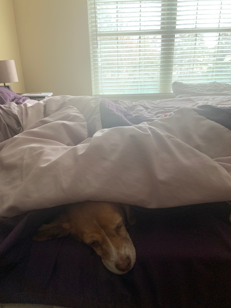Cheagles rarely get sick, but they experience sympathetic sickness with their owners. It’s especially taxing when both of Henleys parents are sick. Here she is both acting as a hot water bottle and resting up to make soup for dinner later.