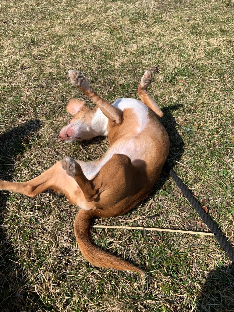 Henley had a great day in the sun; with sand and rolling. Cheagles are partially solar powered so they love to sit out in the sun!