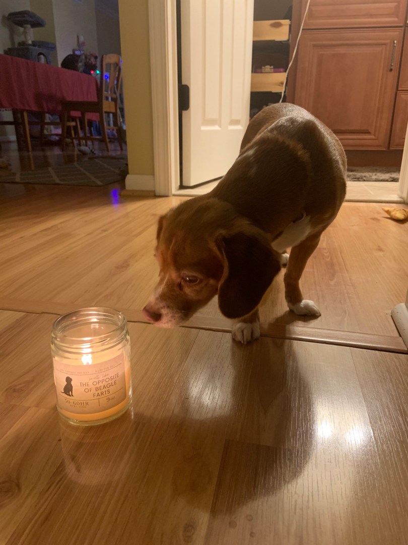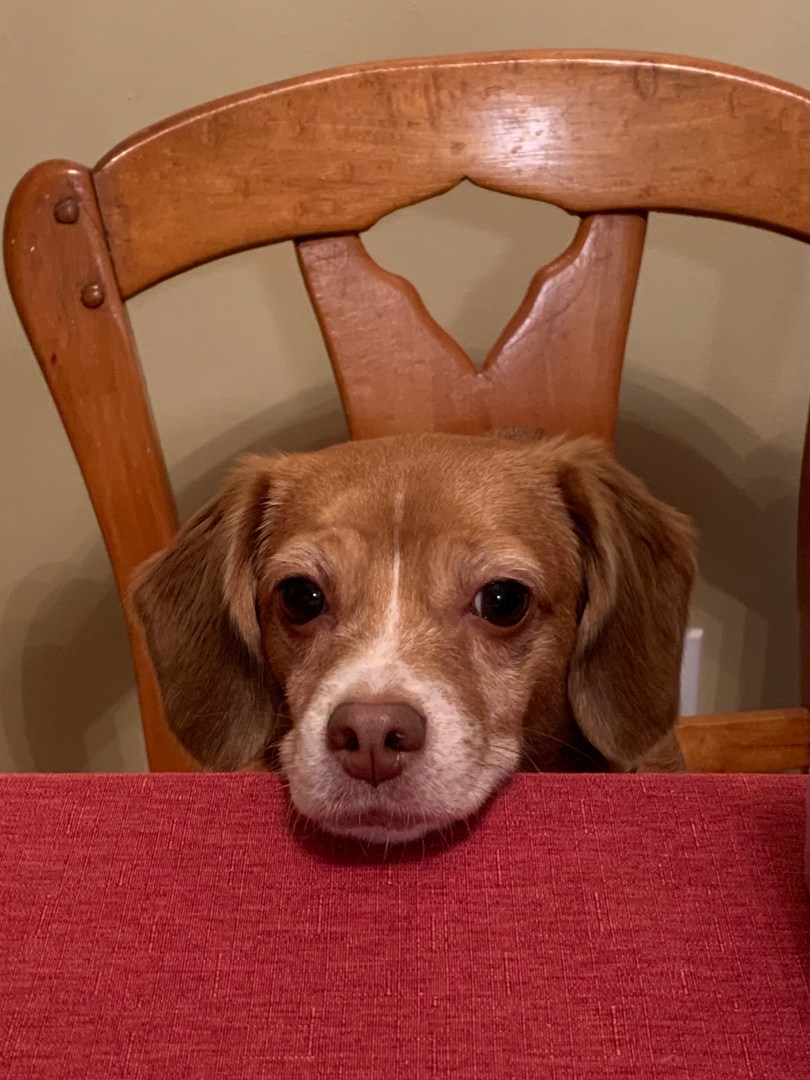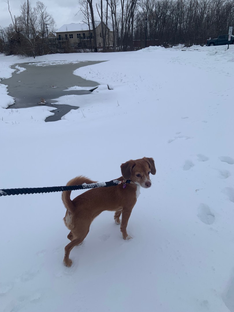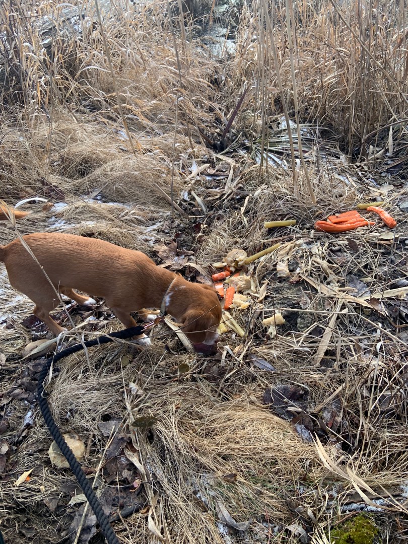 Cheagles have excellent noses which comes from their beagle heritage. They are quite keen to use their noses for scrounging and sometimes happen upon a jackpot. Today, Henley found a feast that was thrown out near the small wetland. She made away with as much as she could before I could realize that chicken was hidden among the veggies.
