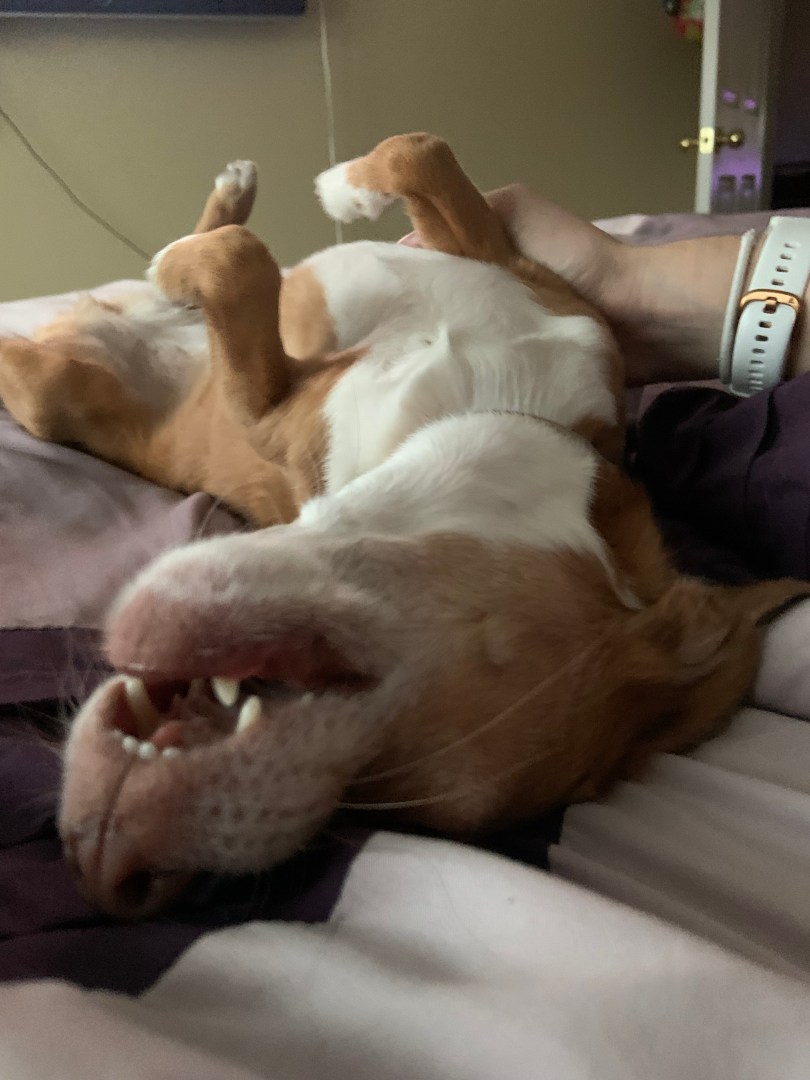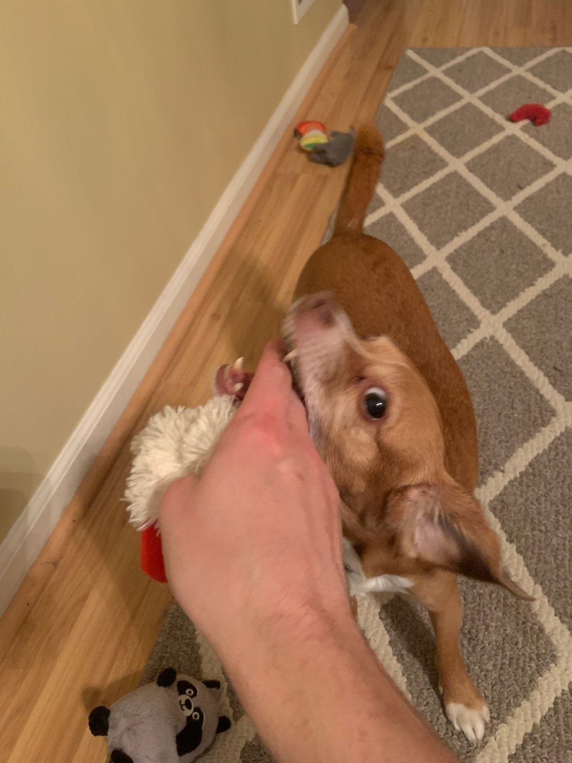 Something very important to know about Cheagles is that they are just as likely to want to play with your hands as they are a toy. They inherit this from their Chihuahua heritage. As fearsome as they look, they can be quite gentle. In this photo Henley has clearly opted to munch on fingers rather than her lamb toy, but she is applying a light touch as she knows it’s play and doesn’t want to hurt me. Sometimes entire play sessions will be dedicated to her trying to catch my hands before I can grab her paws, side, or tail; inevitably she wins.